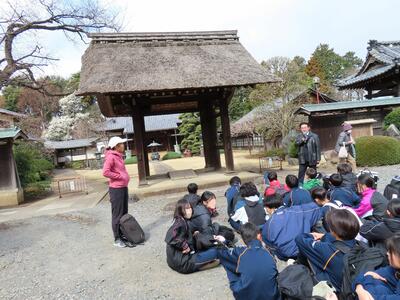学校から「峯ヶ岡八幡宮」「安行原の蛇造り」「金剛寺」を経由して目的地の「いいなパーク」へ、ここで資料館見学、スケッチ大会を行い、お弁当を済ませて、午後は「赤山陣屋」「新郷貝塚」を見学したのち学校に戻ってくるルートを通りました。歩いた距離は合計16キロ、1年生は最後までがんばって歩き通しました。